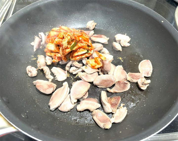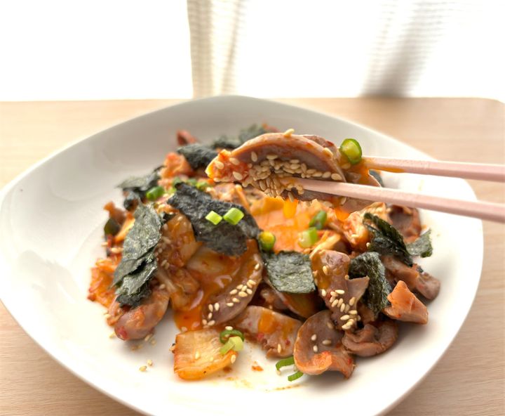 3. キムチ×砂肝で…必ず沼る「ズリキムチ」だって⁉コリコリ食感とキムチの辛味で無限系!【馬場ごはん】