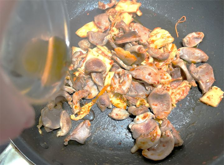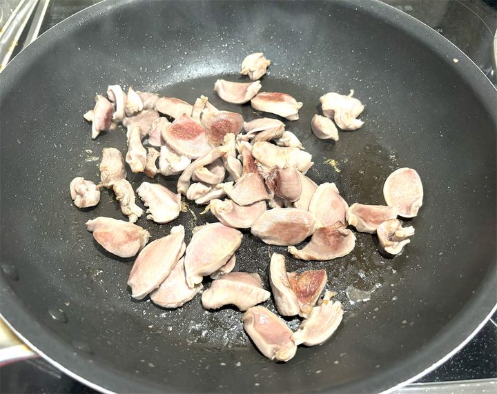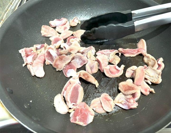 砂肝の色が全体的に変わるまで、しっかりと炒めていきます。