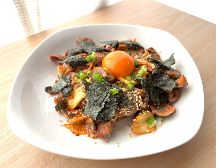 そこへキムチを加えてさらに炒め、