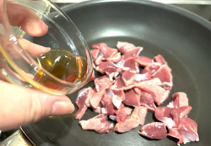 フライパンに2の砂肝を入れ、その上からゴマ油小さじ1を回しかけてから火をつけます。