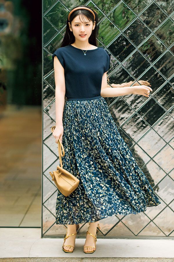 サマーニット+小花柄スカートのワンツーは、フレンチシックなムードで美人感が急上昇♡ 夏向きのさらっとした生地感が気持ち良いGUのニットはどんなボトムにも合わせやすいネイビーで知的に。軽やかな小花柄スカートはウエストがゴム仕様なのもうれしいポイント。