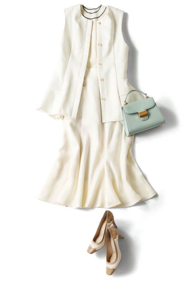 リブニットにツイード……素材違いのアイテムを合わせることで全身白コーデにメリハリをプラス。立体感のあるジレとスカートのヘムでも動きをつけてドラマチックに。