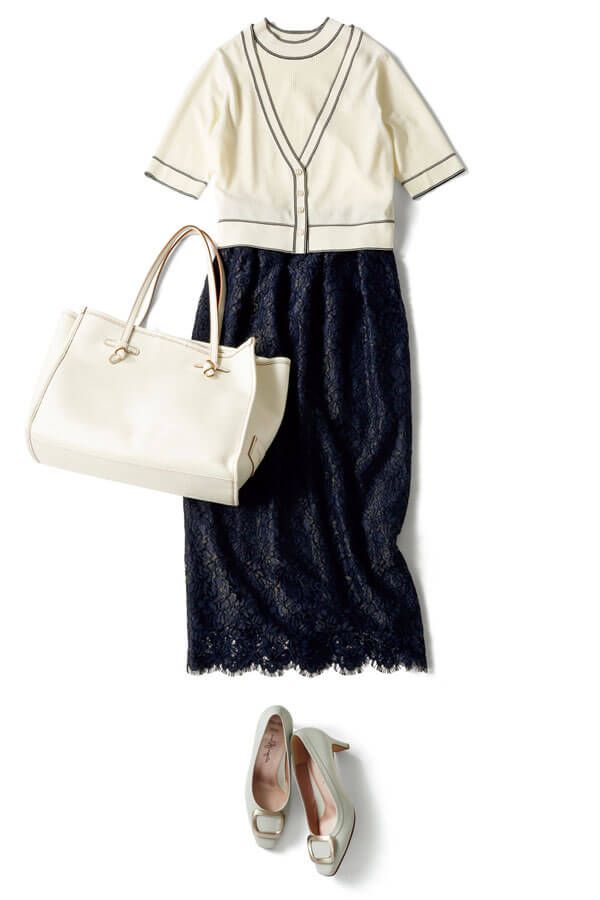ジャストサイズなニットアンサンブル&ペンシルラインのスカートですらっと細見え。冷房の 寒さ対策としても、カーディガンはサマーワークの必需品。