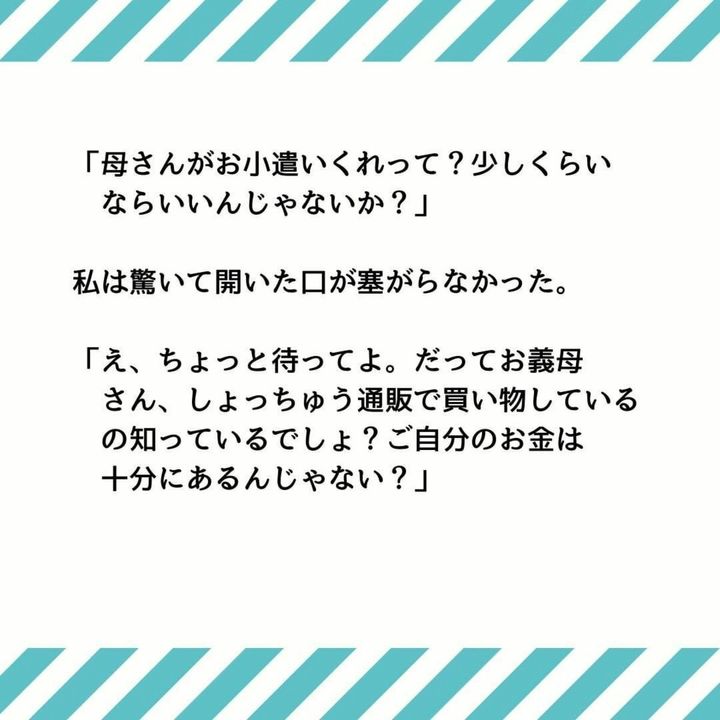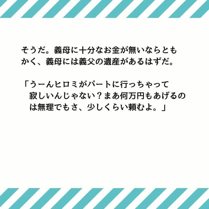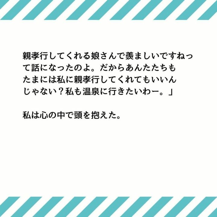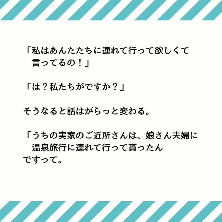 義母は、お小遣いをもらえるようになったことで息子夫婦は自分の思い通りに動いてくれると思っています。わがままがさらにエスカレートし「温泉旅行で親孝行しろ」と求められ、ヒロミも頭を抱えています。