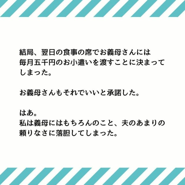 この作品は、結婚2年目のヒロミが主人公です。突然始まった義母との同居をきっかけに夫との関係に変化が起き、さらには義母の借金が発覚。最終的にヒロミが離婚を決断するまでを描きます。夫婦の話し合いで、毎月5,000円のお小遣いを義母に渡すことが決まりました。ヒロミは、夫が義母の言いなりで頼りにならないと知り落胆。そんなある日、義母は「温泉旅行に連れて行ってほしい」と言い出し、ヒロミは頭を抱えます。スカ子|嫁姑・バトルストーリー(@sukako_sukatto)さんによる『義母が内緒で借金していました』第20話をごらんください。