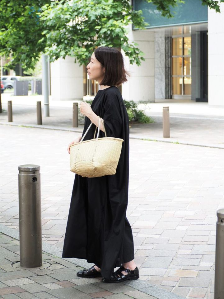 「洋服を選ぶ上で、素材はかなり重視しています。この歳になって好きなものが一貫するようになってきたので、流行にはとらわれなくなりました」。そんなYUさんがこの日着ていたのは軽いコットン素材で、涼やかな着こなしが叶う「アーツ&サイエンス」のロングワンピース。「黒は定番カラーですが、夏は素材で軽やかに見せるのがポイントかなと。シワになりにくいのでお手入れも楽ちんです」