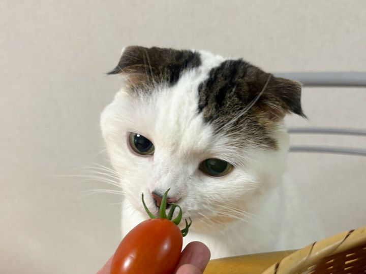 すんすん……。ねこ草みたいな匂いがするけど、ねこはヘタ食べたらあかんでー!