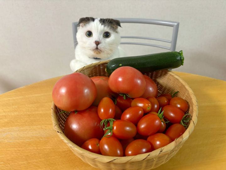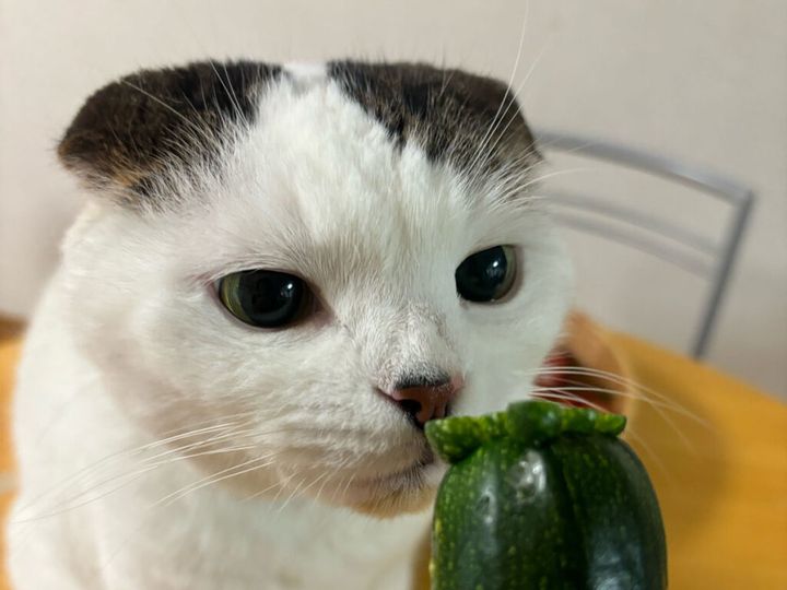 こちらは立派なズッキーニ! ズッキーニはねこにも良い食材らしいよー。いつものパウチもおいしいけど、手作りごはん期待してるで、飼い主ー。