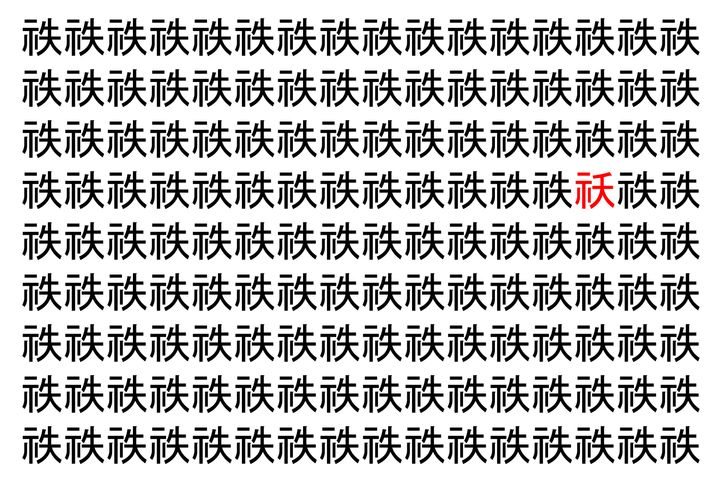 画像の中には、「祑」という漢字が縦に9行、横に16個並んでいます。 全部で144個となりますが・・・、そのうち1つは「異なる漢字」となってますよ!!