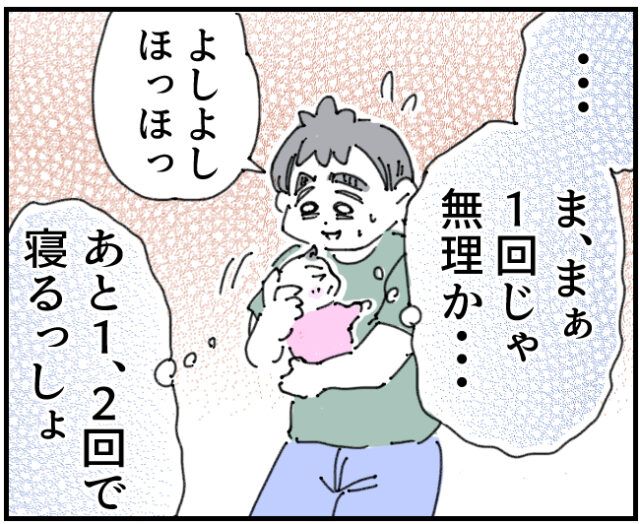「・・ま、まぁ1回じゃ無理か・・」そう思いながら寝かしつけるいちろうさんは、「あと1、2回で寝るっしょ」とやっぱりあきらめていない様子でした。