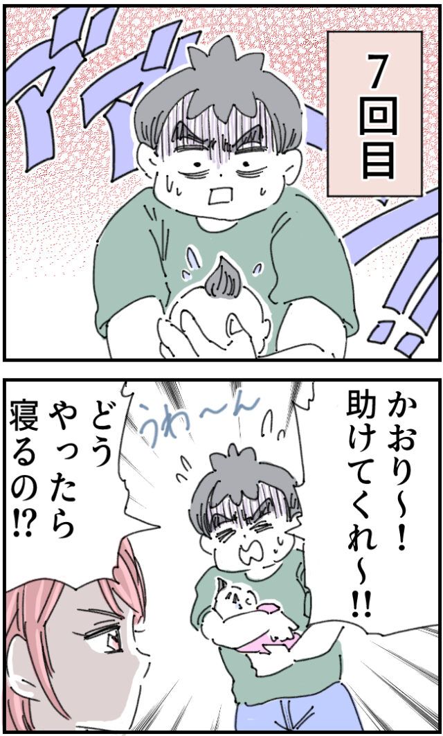 そして7回目になり「あ゛あ゛~~っ!!泣き止む気配のないこはるちゃんを見て「かおり~!助けてくれ~!!どうやたら寝るの!?」といちろうさんは、かおりさんに助けを求めました。
