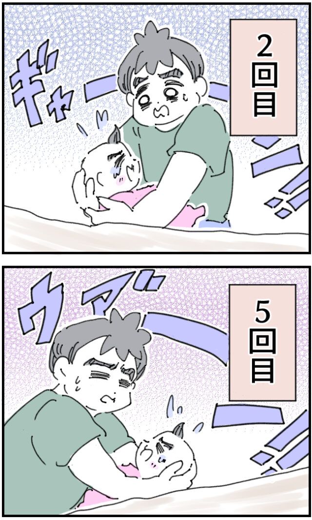 そして2回目、寝たかと思いきややっぱり泣き出してしまいました。そして5回目・・横に寝かせようとするとすぐに気づいてしまいます。