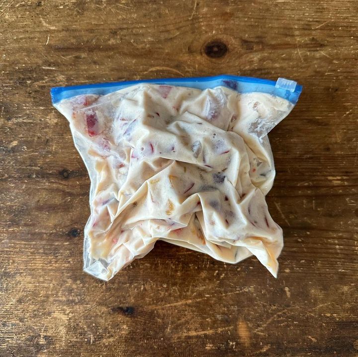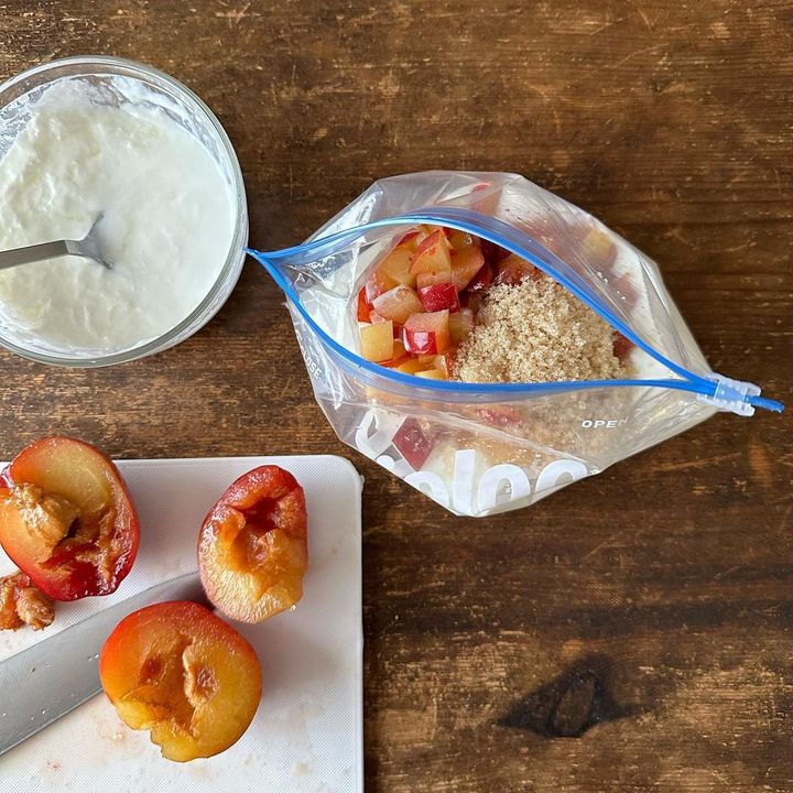 1. ヨーグルトやカットしたプラムなど全ての材料を保存袋に入れる。