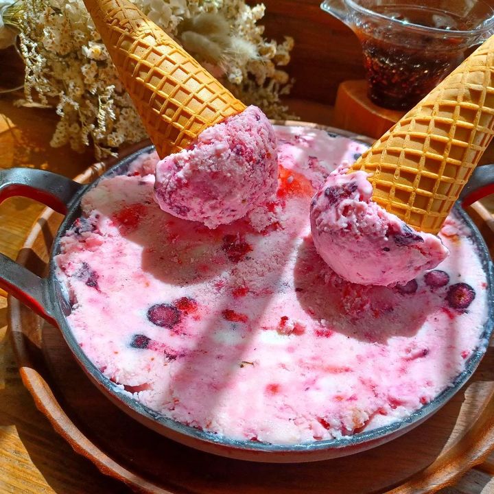 かわいいピンク色が印象的なフローズンヨーグルトにサクサク香ばしいアイスコーン、子どもから大人まで喜ばれること間違いなしです。