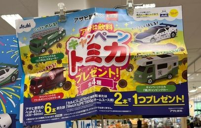 前回同様、アサヒ飲料の対象商品を買うとオリジナルのトミカがもらえるキャンペーンです。