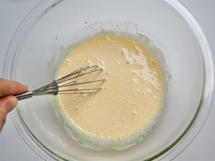 8. 74の卵液を入れ、均一になるようによく混ぜ合わせる。カップなど注ぎやすい容器に入れる。