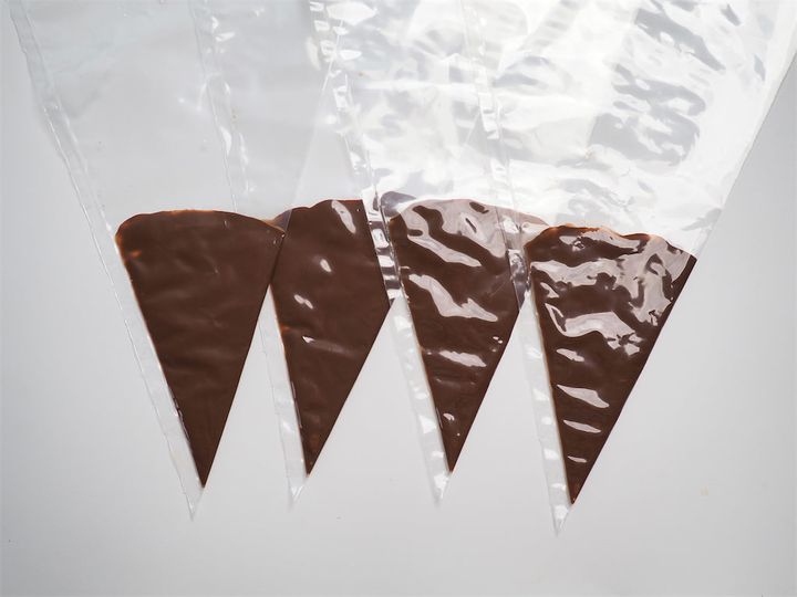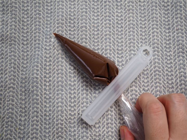 6. ダークチョコレート20gを湯煎にかけ、別の絞り袋に入れ箸をクリップなどでしっかりと留めておく。
