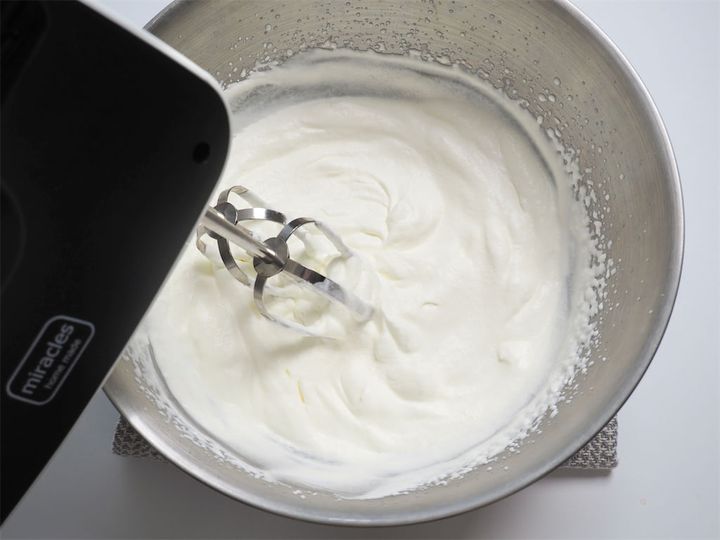 7. ボウルにホイップクリームを入れ軽くツノが立つくらいのクリーム上にホイップしていく。