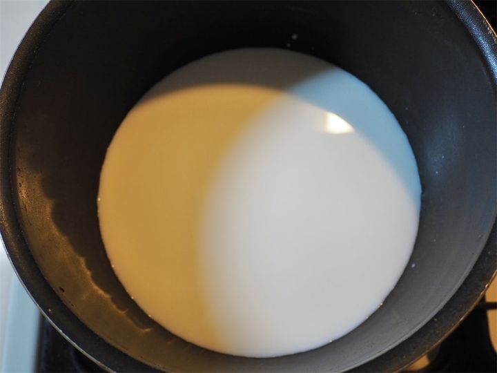 3. 小鍋に牛乳を入れ弱火にかけ、鍋の端っこが沸騰し始めたらすぐに火を止める。