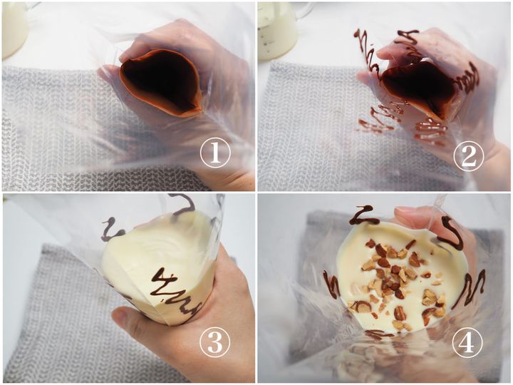 9. 6の模様用の絞り袋の端を少し切り、5のアイスクリーム用の絞り袋の上の部分に均等に5本波線を描いたら、8を注ぎ入れ上にナッツを散らす。