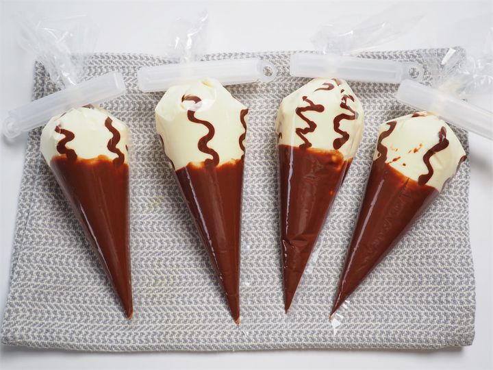 波線を書くときは、チョコレートの絞り袋の先端をアイスクリーム用の絞り袋にくっつけて描くといい感じに。