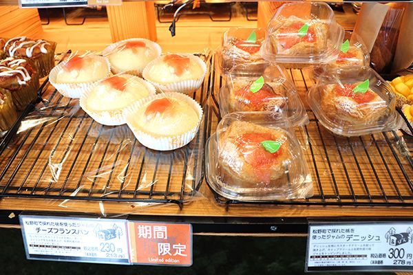 松野町特産の桃を使った商品も期間限定で販売されていました。 それがこちらの「チーズフランスパン」と「デニッシュ」。