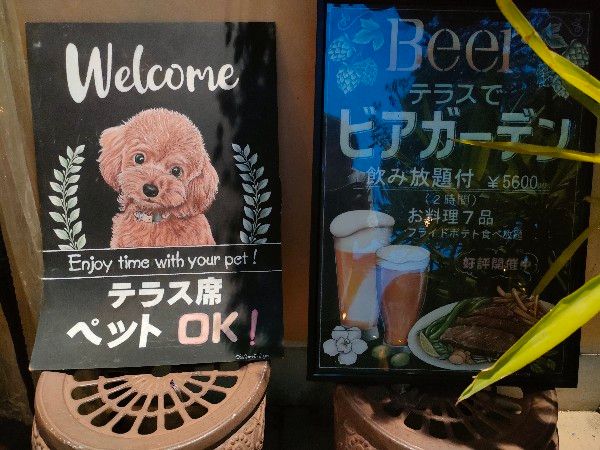 レストランの入口には、テラス席ペットOKの看板があります。少し首をかしげたトイ・プードル、とっても可愛いです!暑い夜だったのですが、扇風機をつけてくれました。