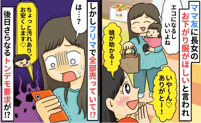 「お下がり服ちょうだい♡」善意で譲った長女の服をフリマで売るママ友がさらに信じられない要求を!?