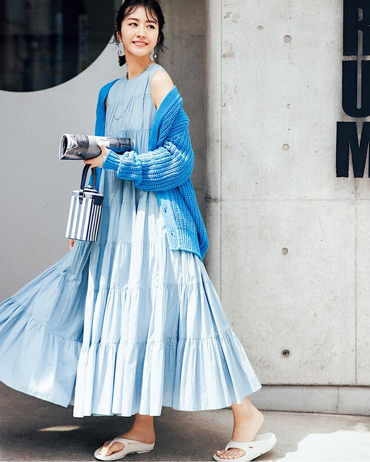 8月28日(日)、涼しげカラーのサマーワンピを夏の終わりに着るなら、同系色の羽織りをプラスして、ワントーンで。ざっくりとしたオーバーサイズのカーディガンをチョイスすれば、上品ワンピにメリハリが効いて、あか抜けコーデが完成します。