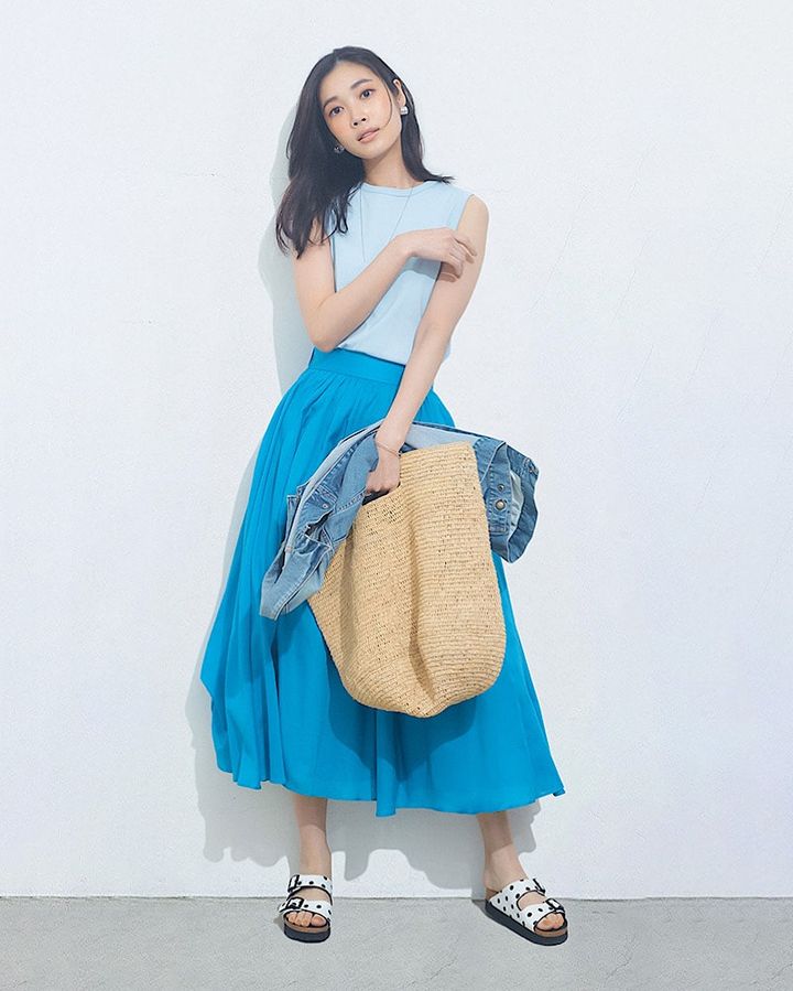 7月23日(日)、夏の日差しに負けないカラーコーデは、心躍るお出かけシーンに一役。爽やかなブルーのスカートを主役に、同系色のトップスでつくるワントーンで夏らしさを意識して。アクセサリーはあえて控えめなものを選ぶ引き算テクニックは、やり過ぎず、大人っぽい装いに仕上げるポイントです。