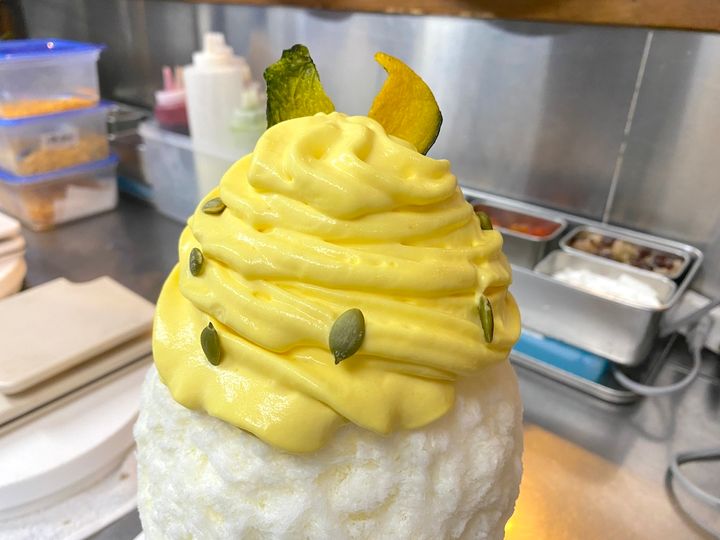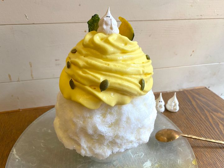 丸いフォルムのかき氷ができあがったら、最後にミルクソースとカボチャのエスプーマを山盛りにかけ、カボチャの種とカボチャチップスをトッピングしたら完成。きれいなイエローカラーのビジュアルについカメラを向けたくなるはずです。