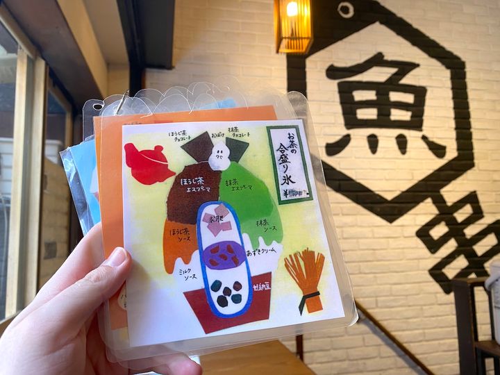 「お茶の合盛り氷」は、抹茶とほうじ茶2種類の味わいが楽しめるお茶ラバーにはたまらないかき氷。中には自家製ミルクソースをベースに、抹茶ソースやほうじ茶ソースをかけ、甘納豆、あずきクリーム、大福などに使われる求肥を2層に分けて入れていきます。「氷おばけ」で使用する抹茶やほうじ茶はすべて京都・宇治の手摘みにこだわった最高品質のもの。氷と合わせて食べたときにふわりと広がる香りと風味のよさが魅力です。