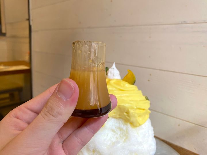 付け合わせとして「とろーりハチミツ西京味噌」がついているので、好きなタイミングでかけて味変も楽しめます。とろーりとしたシロップをかけると、何とも不思議な味わいに。味噌の濃い塩味とハチミツの香りや甘みが絶妙に合わさったクセになるテイストで、かき氷を食べる手が止まらなくなります。