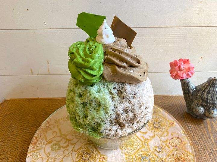 ボリュームもさることながら、抹茶とほうじ茶のカラーリングが鮮やかで食欲がそそられます。トッピングを合わせてひと口食べてみると、まず抹茶とほうじ茶のエスプーマと氷のふわふわ食感に驚き!