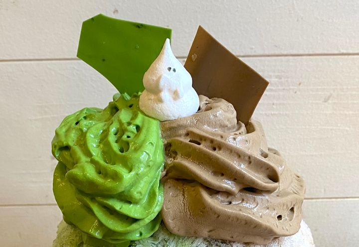 氷とトッピングを重ねていったら、トップに抹茶とほうじ茶のエスプーマをたっぷりとかけ、仕上げに抹茶とほうじ茶のチョコレートとメレンゲでつくった氷おばけちゃんをのせて完成です!