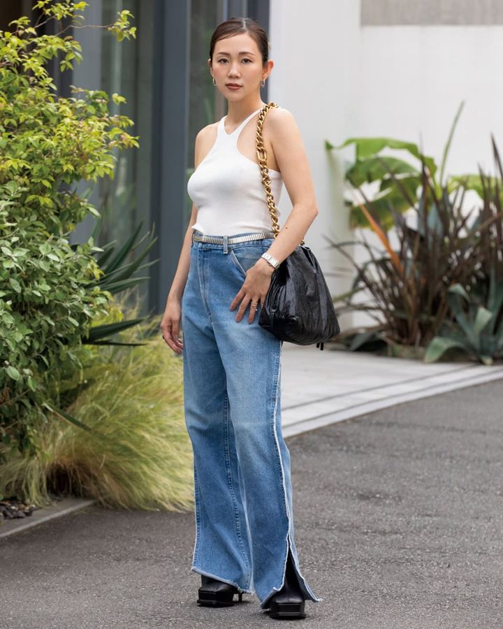 トップス¥20,900(イロット/ザ・ウォール ショールーム)、デニム¥71,500(プロトタイプス/アデライデ)、Peter Doのベルト、BALENCIAGAのバッグ、PHOEBE PHILOのブーツ、Cartierの腕時計は本人私物