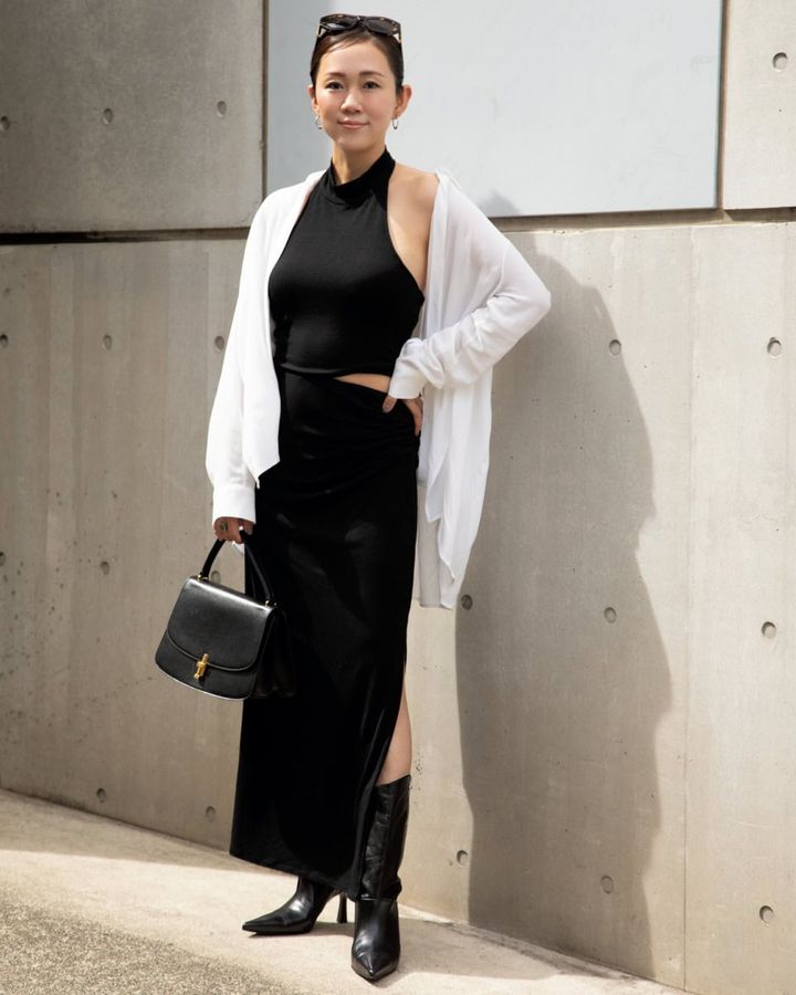 「デタームのドレスは、カップ付きなので機能性もよく、コラーゲン由来のファブリックを使用しているので、着心地も◎。仕立てのよいシャツやウエスタンブーツを合わせて、リラクシーな印象になり過ぎないような着こなしに」