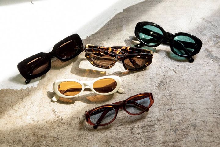 左から:〈VIVIAN〉¥49,500、〈Naomi〉¥49,500(共にDMY ストゥディオス/ザ・ウォール ショールーム)、BOTTEGA VENETA、OUR LEGACY、ayameのサングラスは本人私物