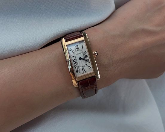 「30歳になった記念に購入した、カルティエの腕時計を毎日着けています。時計好きの父の影響もあり、私のなかで腕時計といえばタンク一択でした。ワードローブがハードなイメージのアイテムが多いので、小物はクラシックなものを選ぶようにしています」