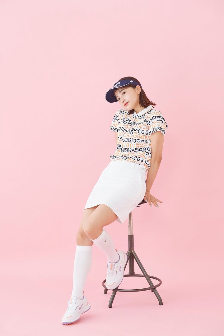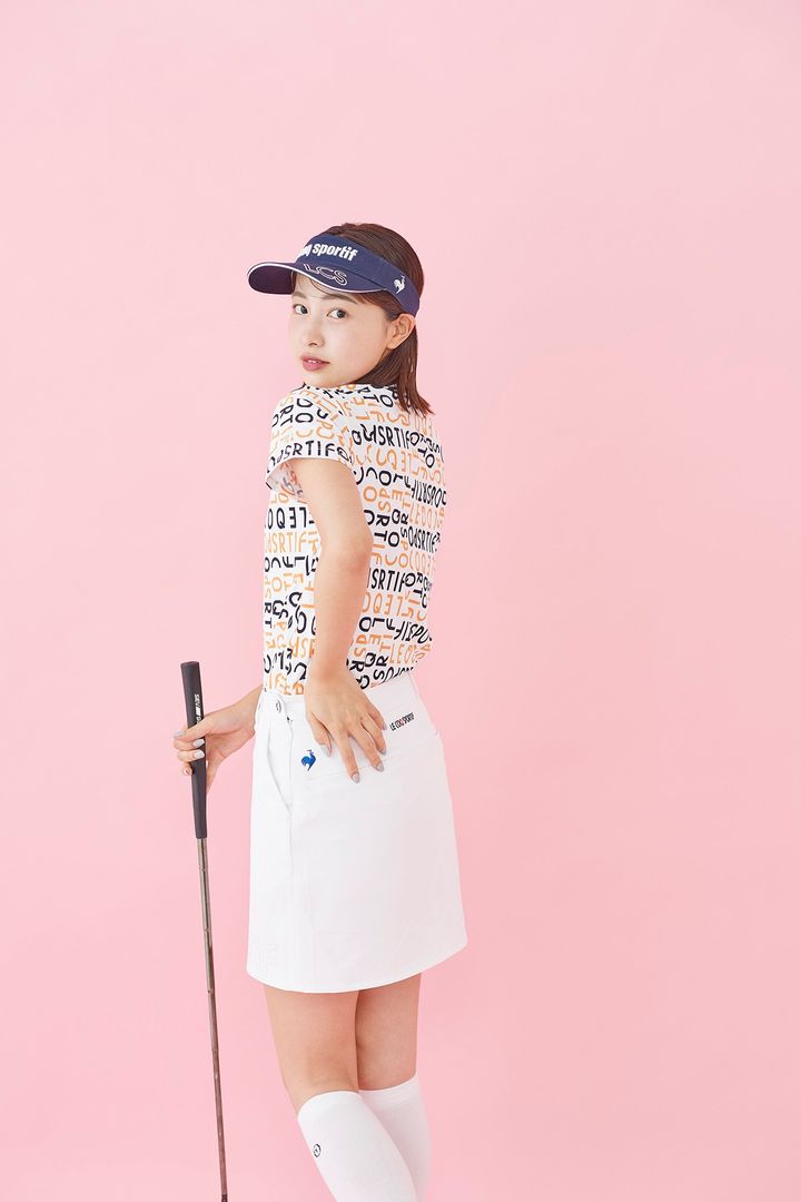シャツ¥12,100、スカート¥12,100、サンバイザー¥3,300/ルコックスポルティフ ゴルフ スニーカー¥9,999、ソックス¥1,098/ティゴラ