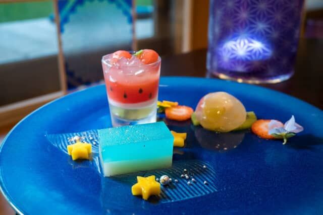 ミニグラスにはスイカのゼリーとパンナコッタが重ねられ、チョコでスイカの種まで再現。水まんじゅうはモッチモチでとっても柔らか。スライスされた苺やキウイが彩りを添えています。