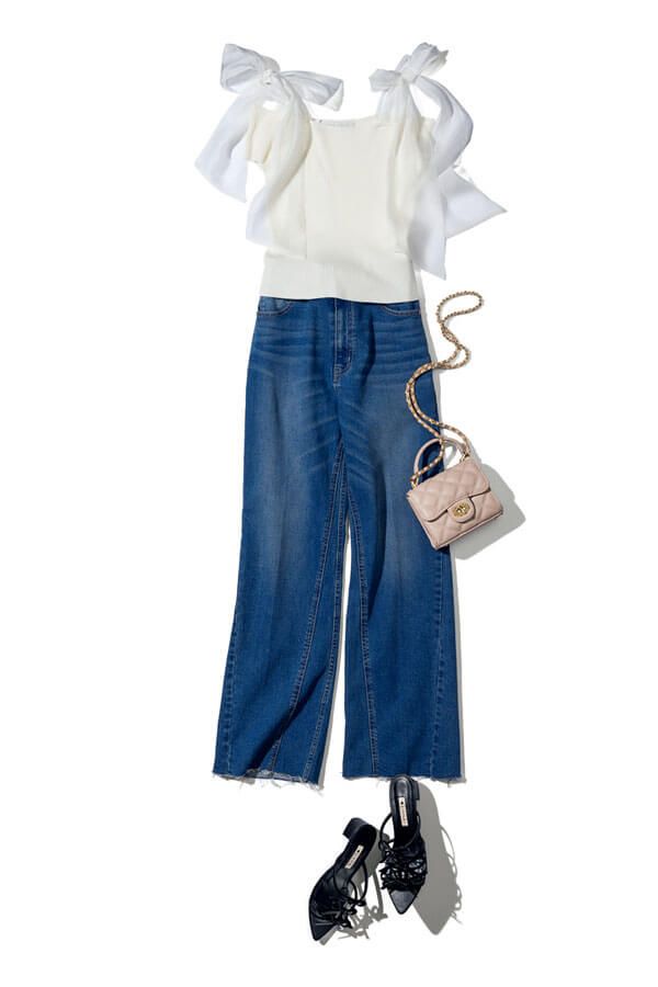 ラフな切りっぱなしデニムなら、甘トップスの糖度を高めても。肩をふんわりリボンが彩るニットと、ヌーディなサンダルでも女っぽさを加速。