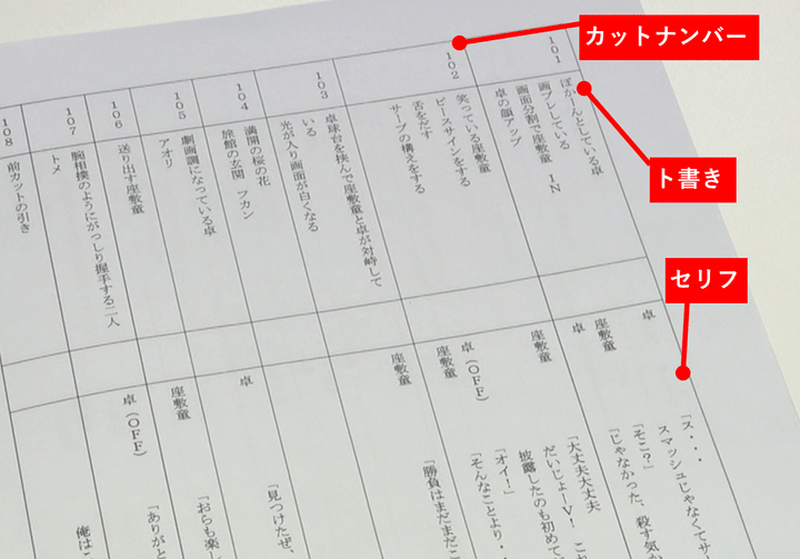 渡邉先生:次に、「カットナンバー」の下に書いてある部分です。ここを「ト書き」といいます。たとえば、カットナンバー101の下には、「ぽかーんとしている卓」とありますね。「ト書き」には、映し出されている映像について、簡単な説明が書かれています。