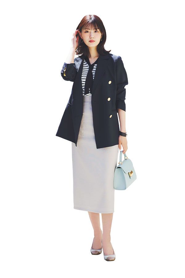 ジャケット¥28,600/FRAY I.D ニット¥4,400/オぺーク ドット クリップ タイトスカート¥19,800/アンタイトル バッグ¥12,900/CHARLES & KEITH パンプス¥18,700/ダイアナ(ダイアナ 銀座本店) イヤリング¥60,500/ケンゴ クマ プラス マユ(ヴァンドームヤマダ) 腕時計¥29,700/プラス ヴァンドーム