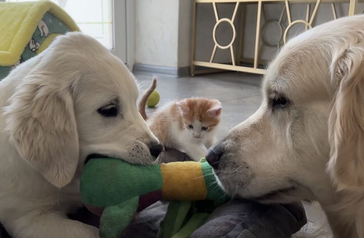 犬さんと遊ぶのが大好きな子猫♪ 今日も3匹で仲良く遊ぶよ!