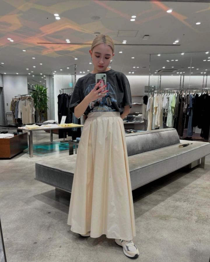 白のロングスカート×バンドTで今っぽ感アップ♪