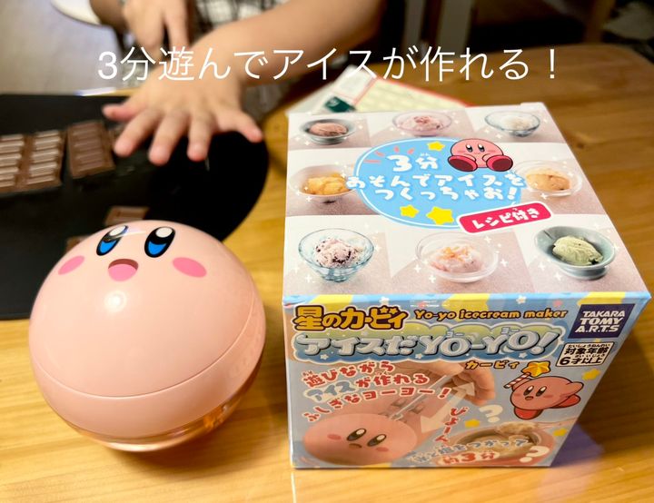 「アイスだヨーヨー カービィ」は、外側に氷と塩と水が入れられて、真ん中にアイスの材料を入れられる容器になっています。この容器にゴムを付けてビョンビョンとヨーヨー遊びをすると攪拌されてアイスができるという、なんとも原始的にして今までなかったおもちゃです。