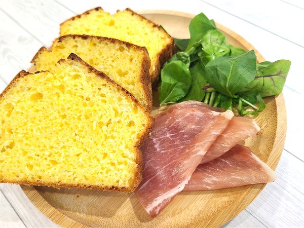 オーブンで焼いているときから家中にとうもろこしの甘いいい香りが広がっていたので、完成につい期待が膨らんでしまいました♪切っても盛り付けてもとにかくいい香り!もちろん食べると口いっぱいにとうもろこしの甘みが広がります!ホットケーキミックスのやさしい甘みが、とうもろこしの甘みを絶妙に引き立ててくれているように感じました。惣菜ケーキというだけあって、食事の際にパン代わりにもなりそうですよ。