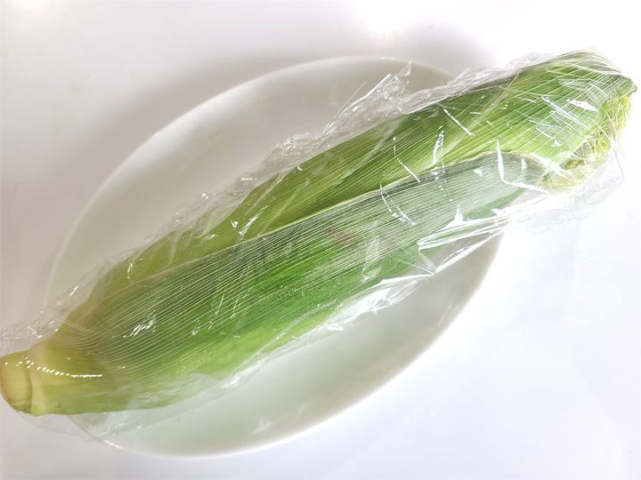 2. とうもろこしは皮ごとラップで包み、700Wの電子レンジで4分加熱します。加熱後は皮とヒゲをとり、包丁で実を取ります。600Wなら約5分ほどでOKでした!