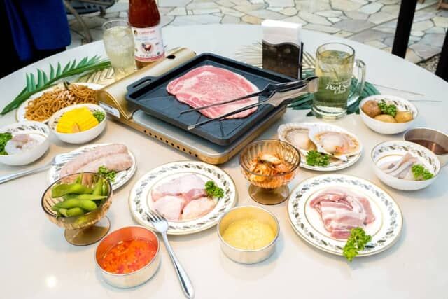 セットメニューは、スタンダードプラン(1人¥6,800)、デラックスプラン(1人¥8,500)、さらに黒毛和牛のリブロースやシーフードなど贅沢なプレミアムプラン(1人¥10,000)の3タイプ。アルコールを含むドリンクも2時間フリーフローで楽しめます。